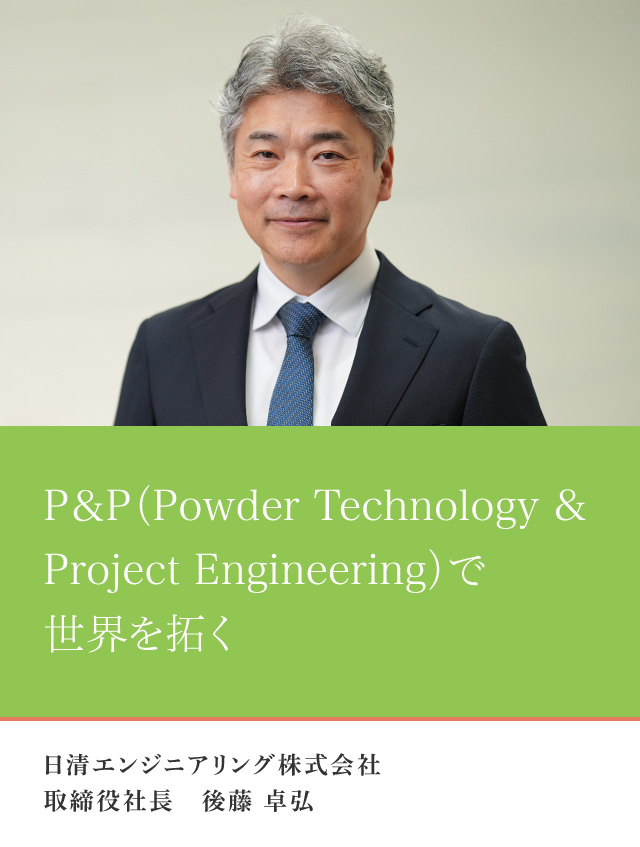 コーポレートスローガンとして「P&P(Powder Technology & Project Engineering)で世界を拓く」を掲げていますが、このベースとなるのはユーザー系エンジニアリング会社ならではの「顧客視点のエンジニアリング」と長年培ってきた「粉体技術」です。