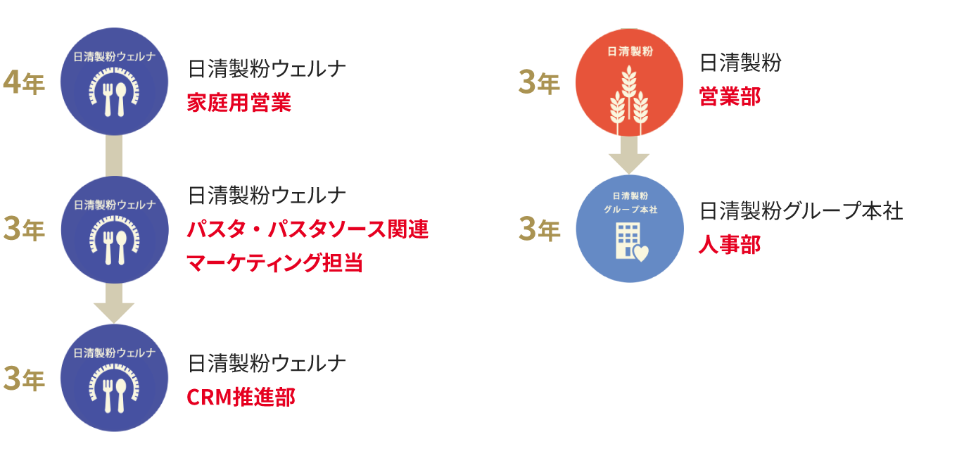 | コース詳細 | お客様との信頼関係の構築とソリューション提案を通して、BtoC領域では消費者の豊かな食生活に貢献し、BtoB領域では顧客の企業価値向上を目指します。また、お客様のニーズや市場動向の洞察をもとに、戦略的なプロモーション活動や魅力的なブランドイメージを構築し、当社グループにおけるブランド価値向上による市場創造や需要喚起を図ります。 初任配属は各社の営業(本社・地方)とし、その後は適性に応じて、営業・マーケティング、(株)日清製粉グループ本社 コーポレート部門などでのキャリアアップを目指します。 |