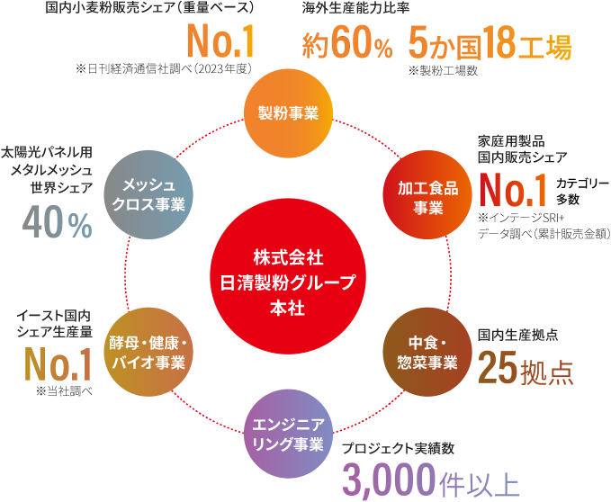 日清製粉グループは、多彩なマーケットへベストフィットするために7つの事業ごとに自由な意思と戦略を持ち、それぞれのマーケットへシャープにアクションを起こせるプロフェッショナル企業の連合体として活動しています。